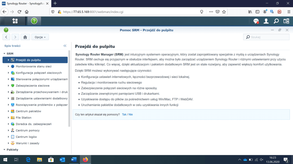Wszystkie funkcje jakie oferuje RT2600ac opisane są po kliknięciu na ikonę „Pomoc SRM” (to ta u dołu ekranu ze znakiem zapytania). Wiele opisów wyda się być oczywistych, na przykład opis funkcjonalności pulpitu SRM bądź opis samego logowania. Jest tu jednak również sporo innych opisów dotyczących wielu przydatnych funkcji. Dostępne są następujące zakładki: