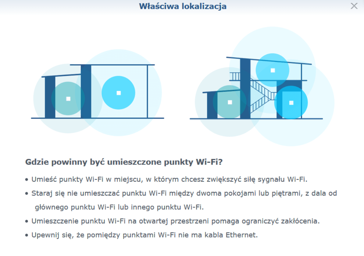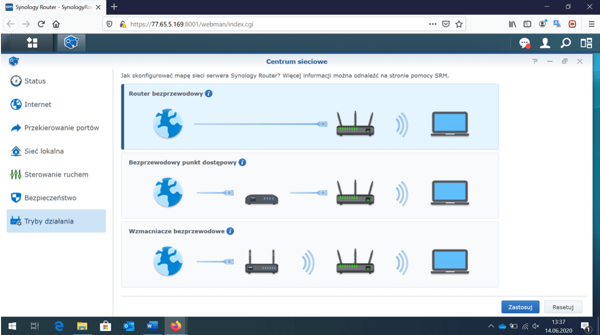 Ostatnia zakładka, o której wspomnę przed konfiguracją sieci mesh to Tryby działania. Tutaj można wybrać czy router ma działać jak router czy może jak punkt dostępowy lub wzmacniacz bezprzewodowy. Więcej na ten temat można znaleźć w Pomocy SRM.