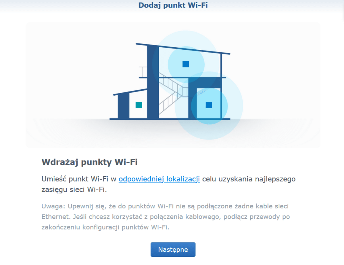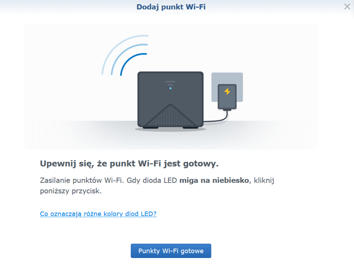 Klikamy na Następne, upewniamy się, że MR2200ac jest podłączony do prądu, włączony a dioda miga na niebiesko i potwierdzamy ten fakt klikając na Punkty WiFi gotowe.