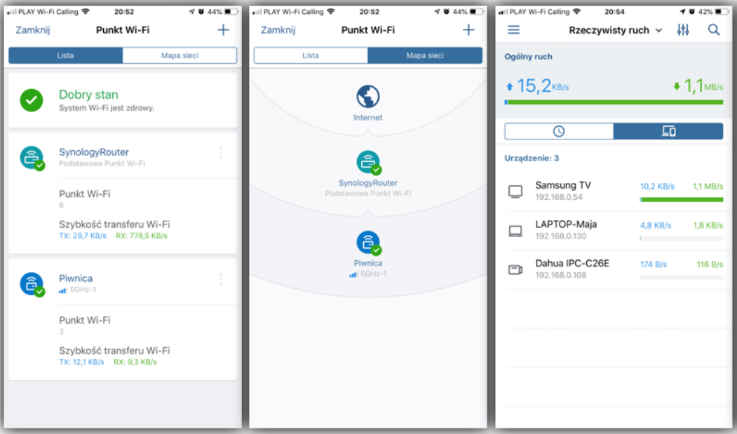Powyżej widać część funkcjonalności aplikacji mobilnej SRM. Dostępny jest między innymi podgląd ogólnego stanu sieci, schemat działających w sieci punktów dostępowych oraz podgląd podłączonych do sieci urządzeń i ruch jaki generują.