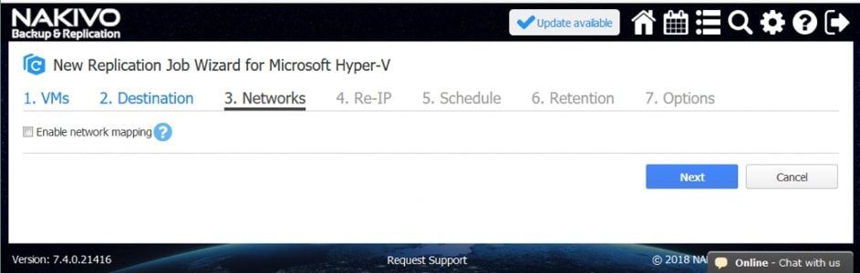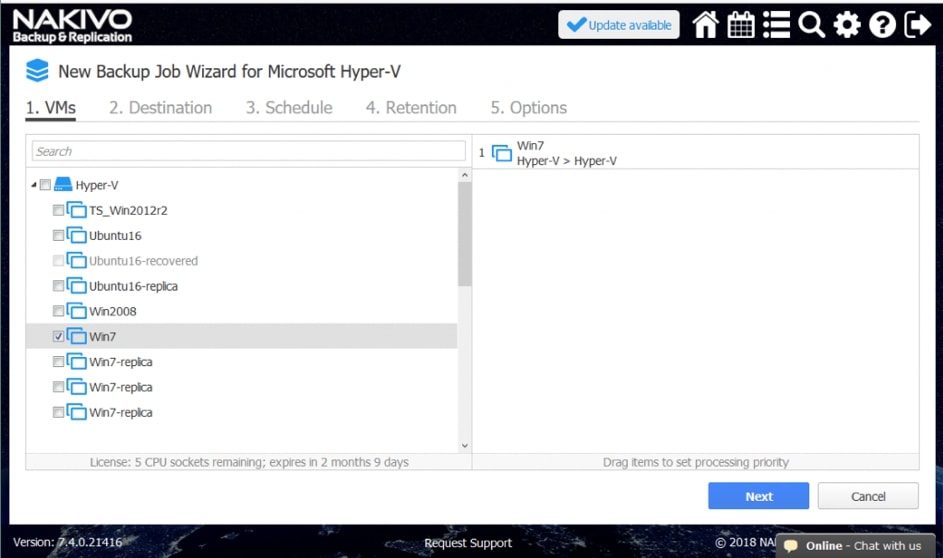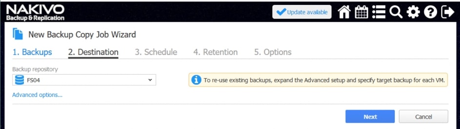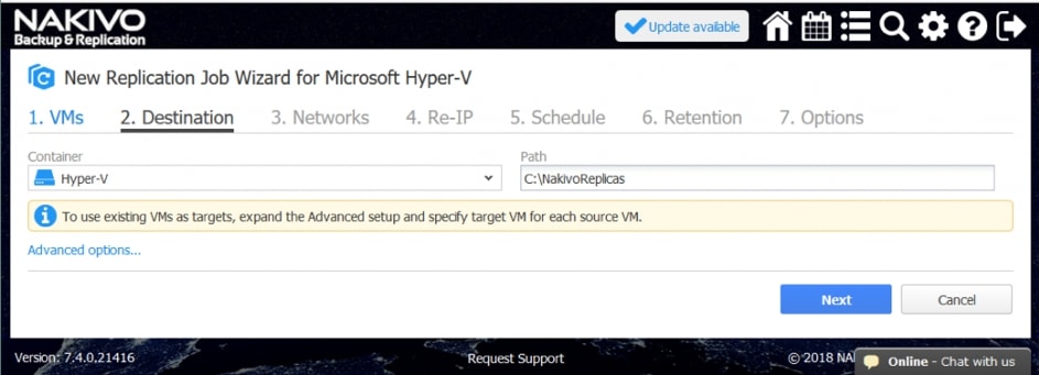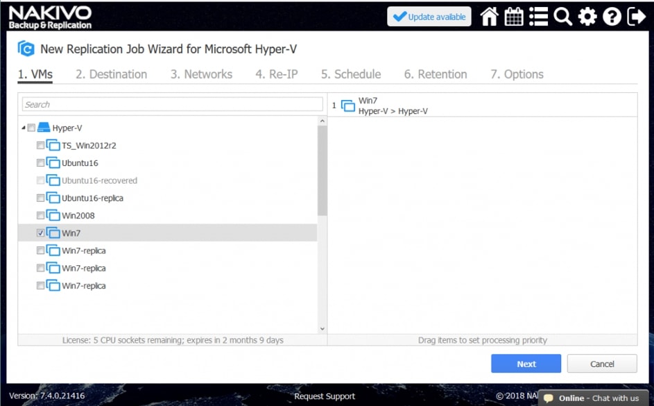 Posiadanie repliki jest warunkiem wstępnym do działania w trybie failover w ramach Site Recovery. Oprogramowanie NAKIVO Backup&Replication może skutecznie replikować maszyny wirtualne lub instancje, korzystając z podejścia uwzględniającego aplikacje. Należy wybrać, które źródłowe maszyny wirtualne/instancje powinny zostać zreplikowane, a następnie zdefiniować serwer docelowy i magazyn danych dla replik.
