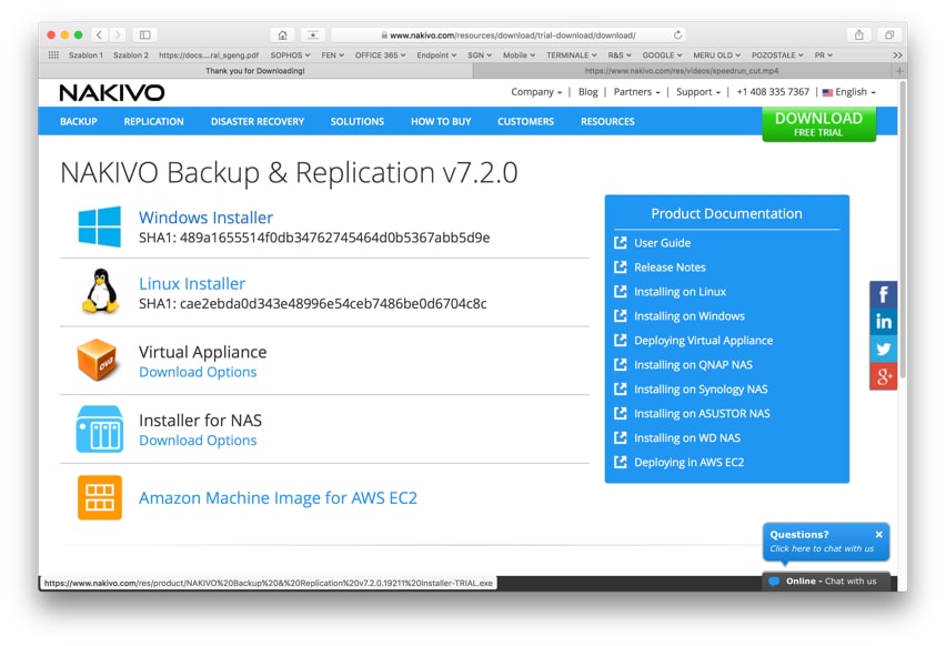Po wypełnieniu formularza otrzymujemy dostęp do pobrania instalatora NAKIVO. Pobierana wersja zależy od tego na czym chcemy zainstalować nasze rozwiązanie backupu, dobrze jest mieć z czego wybrać.
