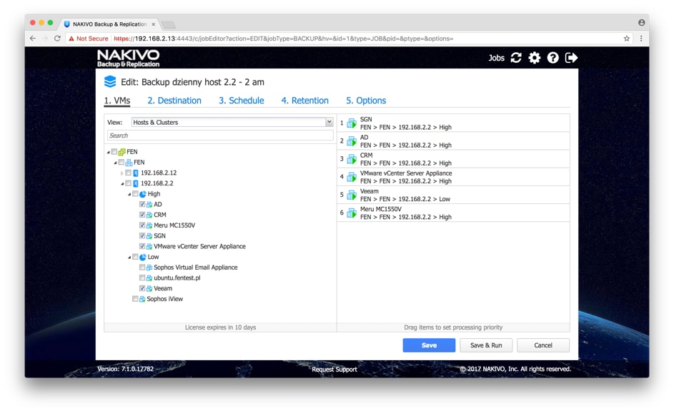 W wypadku FEN wybrana została wersja dla Vmware. Dlaczego akurat ten wariant? Powód był prosty – dostępny był dodatkowy host ESXi z wbudowaną macierzą, wolnym miejscem, który się po prostu nudził. Dodatkową zaletą tego rozwiązania jest fakt, że maszyny można odtwarzać bezpośrednio na dodatkowego hosta, w razie awarii hosta głównego, wirtualki zarchiwizowane przez NAKIVO można odtworzyć na hoście zapasowym.