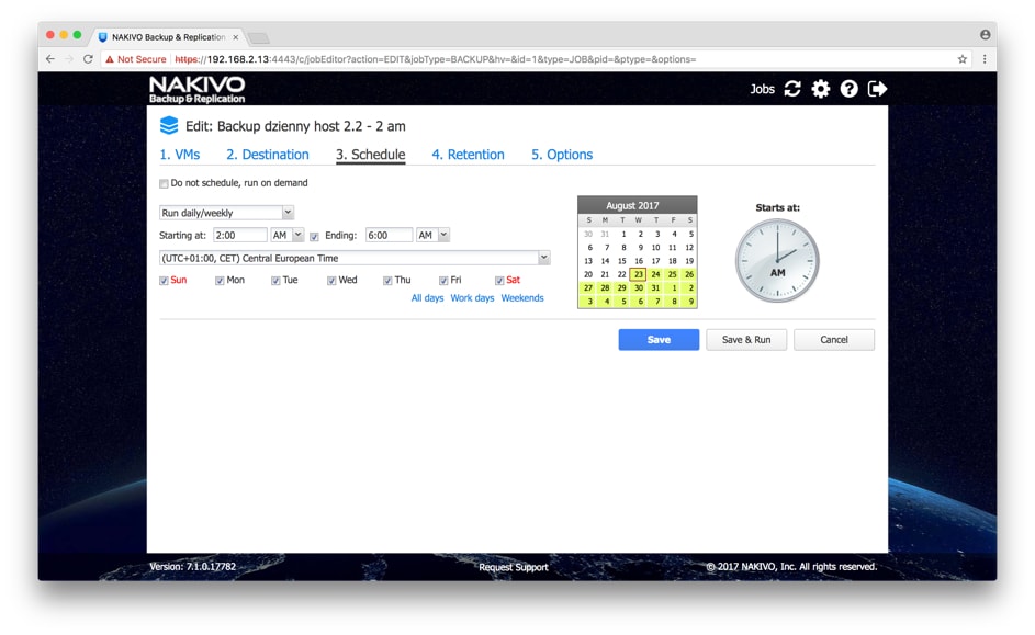 Wdrożenie na VMware opiera się na dodaniu do hosta dodatkowej maszyny wirtualnej (maszyna NAKIVO bazuje na Linksie, więc nie potrzebujemy licencji na OS). Podstawowe ustawienia jak adresacja IP, dostępne są przez konsolę dostępną z VCenter, a pozostałe zarządzanie to już interfejs www samej maszyny NAKIVO. Dla zainteresowanych szczegółami instalacji na VMware polecam ten przewodnik: Instalacja Nakivo na VMware