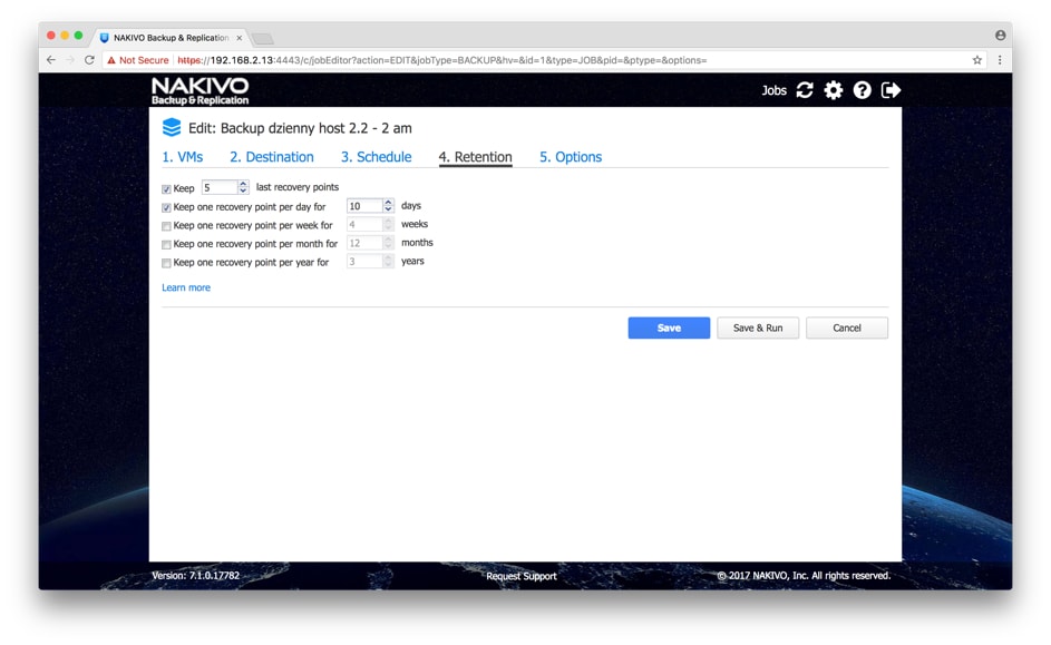 - Określamy ustawienia retencji, czyli przez ile czasu mamy utrzymywać kopie zapasowe i w ilu wersjach