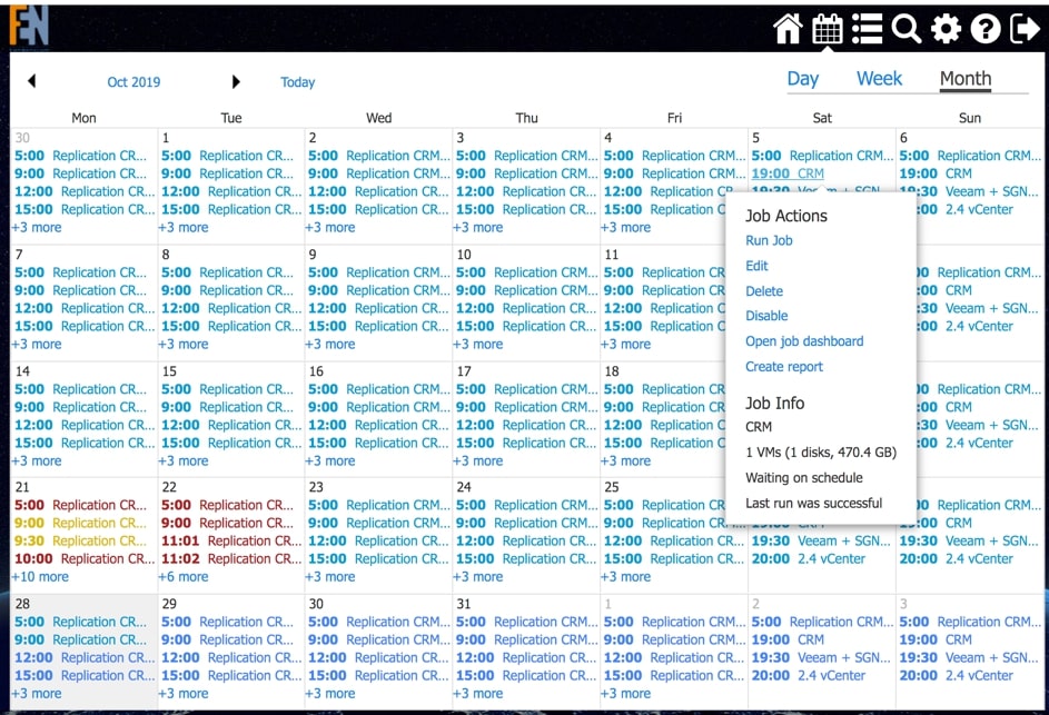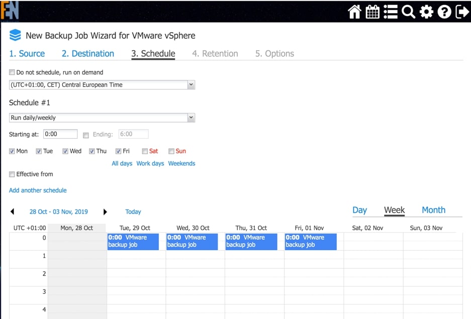 Automatyzacja zadań backupu i replikacji to jeden z elementów na który rozwiązanie Nakivo kładzie duży nacisk. Podstawą planowania procesów automatycznych jest odpowiednie ustawienie harmonogramów kopii zapasowych lub replikacji, w tym celu Nakivo oprócz możliwości utworzenia kilku harmonogramów w jednym zadaniu, udostępnia tzw. Calendar Dashboard dzięki któremu widzimy już zaplanowane zadania i łatwiej planować okna serwisowe.