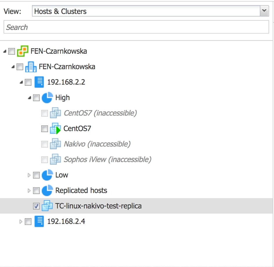 Rys. 3 Widok podstawowy wyboru maszyn do zadania backupu lub replikacji: Hosts&Clusters