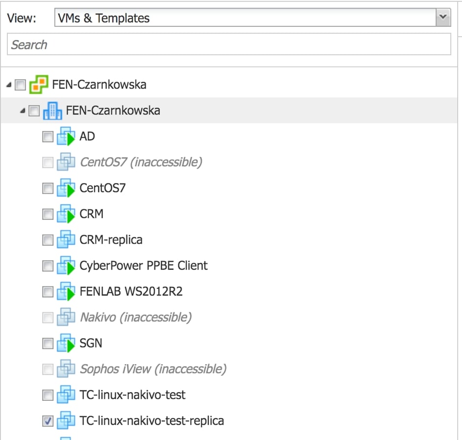 Rys. 4 Widok wyboru maszyn do zadania backupu lub replikacji: VMs&Templates