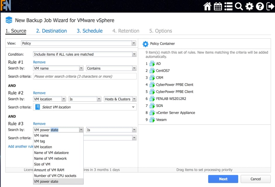 Najciekawszym jest jednak tryb Policy based, w momencie wywołania harmonogramu, zanim backup lub replikacja się rozpoczną administrator może wcześniej zaplanować jakie warunki mają być spełnione, aby zadanie zostało zrealizowane. Warunki można ze sobą łączyć, tworząc bardziej złożone scenariusze uzależniające wykonanie zadania od takich elementów jak: nazwa maszyny wirtualnej, lokalizacja maszyny wirtualnej, datastore wykorzystywany przez maszynę wirtualną, rozmiar maszyny wirtualnej, a także jej aktualny stan. Zastosowanie warunków umożliwia utworzenie zadań, które będą w zautomatyzowany sposób weryfikowały w trakcie wywołania harmonogramu czy nowe zasoby wymagające ochrony nie pojawiły się w naszej infrastrukturze, a jeżeli tak aby je objąć ochroną automatycznie.