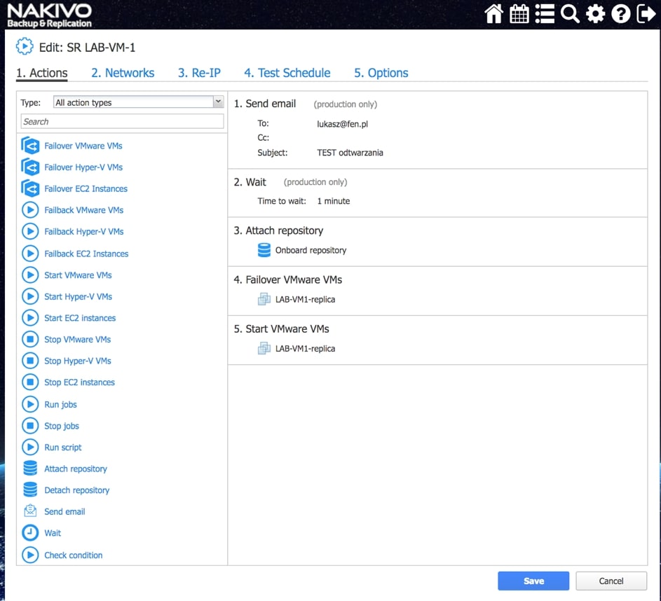 Poszczególne z akcji mają możliwość określenia, które z nich będą wykonywane tylko w czasie awaryjnego odtwarzania, a które w czasie procedury testowej, dzięki czemu możemy zasymulować odtwarzanie środowiska bez szkody dla środowiska produkcyjnego.