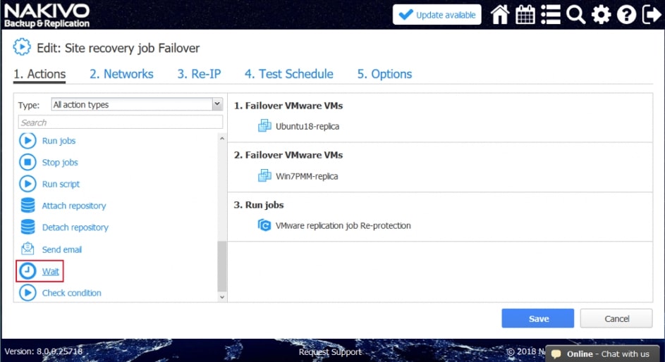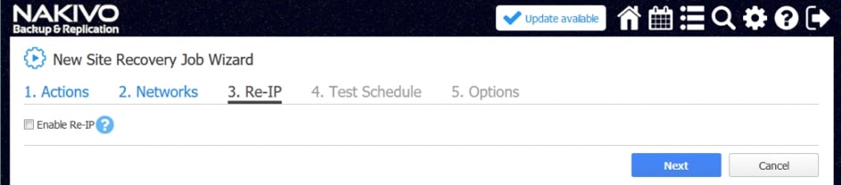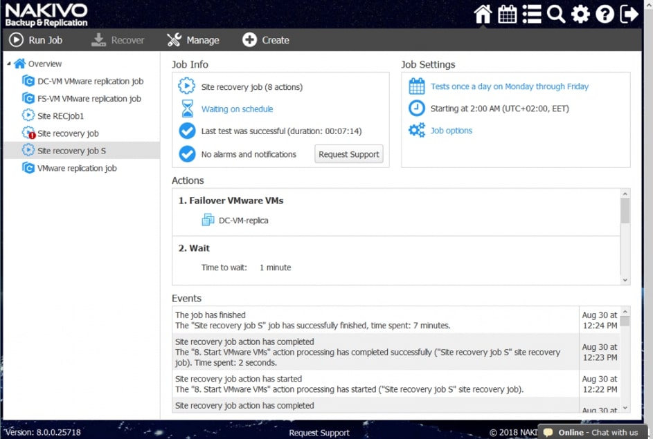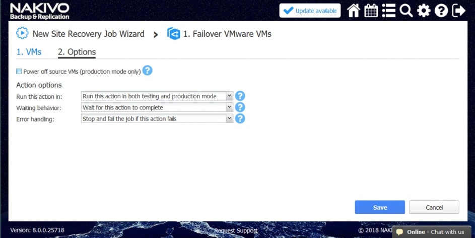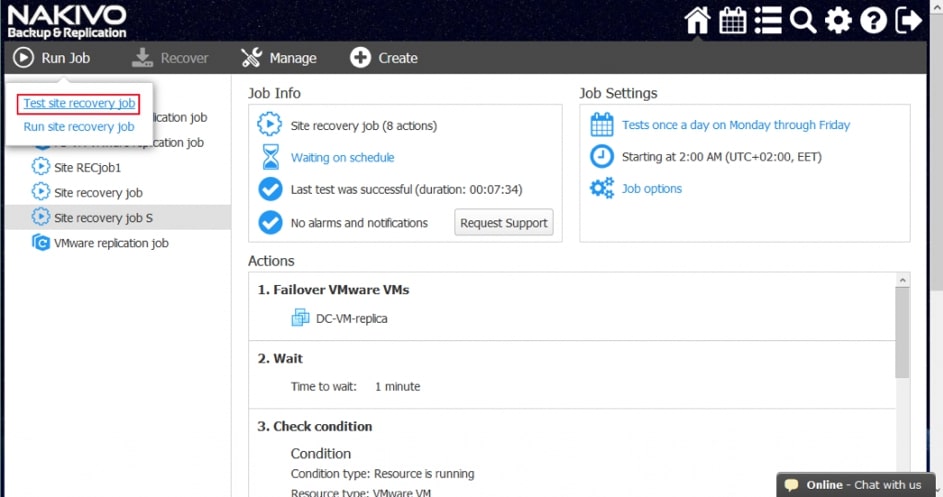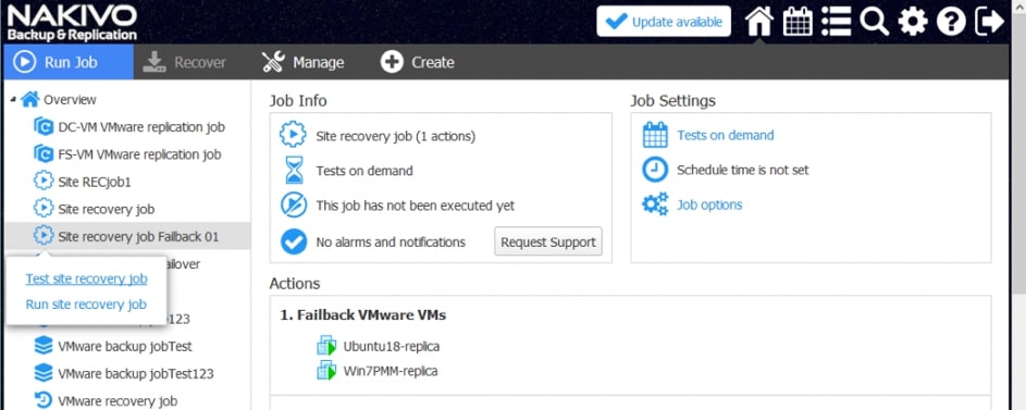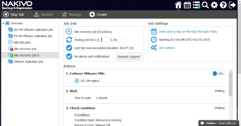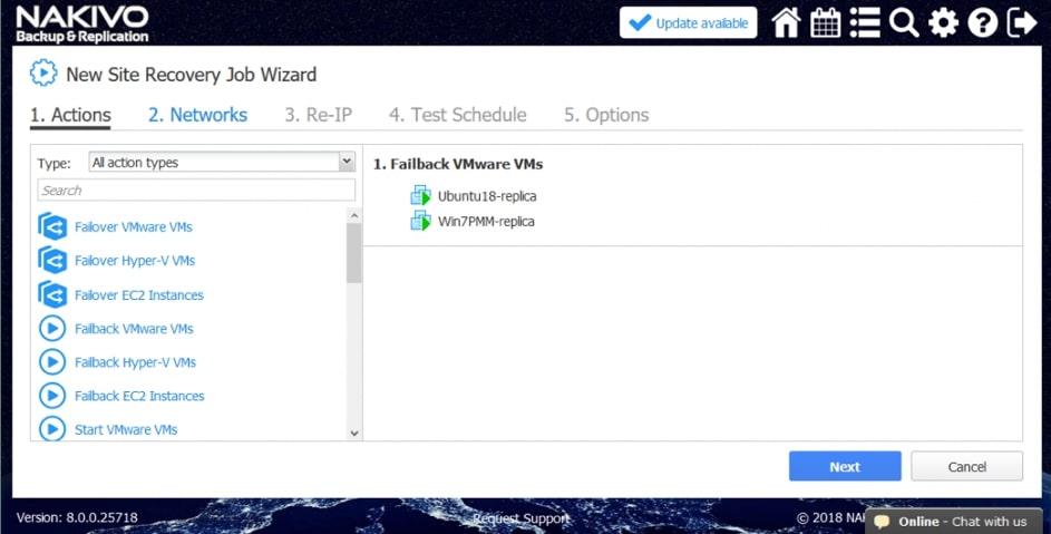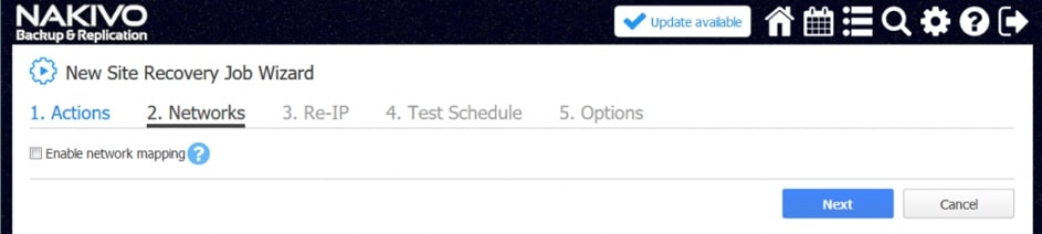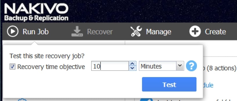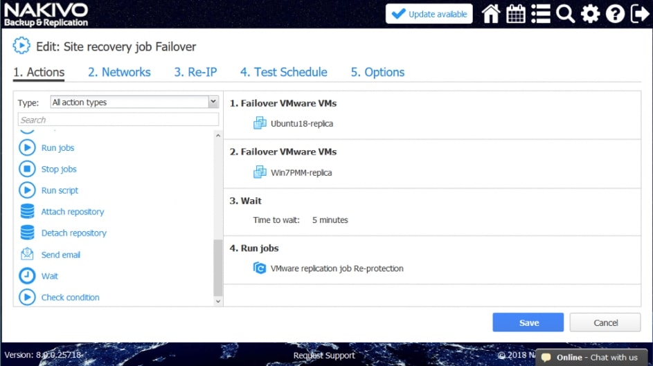 Zwieńczeniem automatyzacji procesów backupu i odtwarzania w Nakivo jest mechanizm Site Recovery. Mechanizm Site Recovery umożliwia utworzenie zestawu akcji, które mają być realizowane przez oprogramowania w określonej przez administratora kolejności w wypadku gdy dojdzie w środowisku do awarii, planowany jest serwis wirtualnej infrastruktury lub musimy udowodnić dla potrzeb wszelkiego rodzaju audytów wewnętrznych i zewnętrznych jak skutecznie i szybko jesteśmy w stanie odtworzyć nasze środowisko.