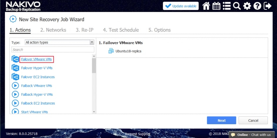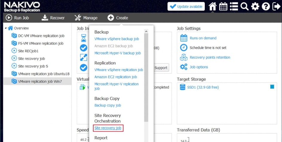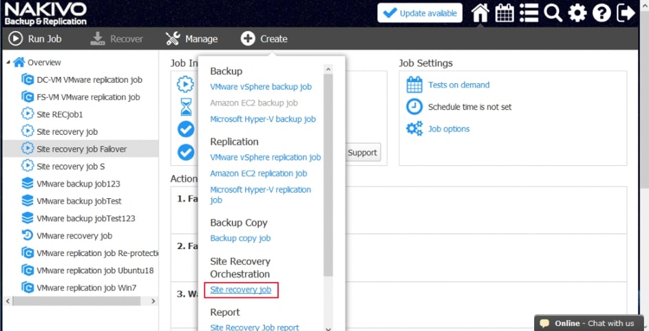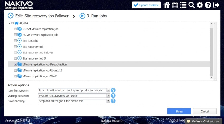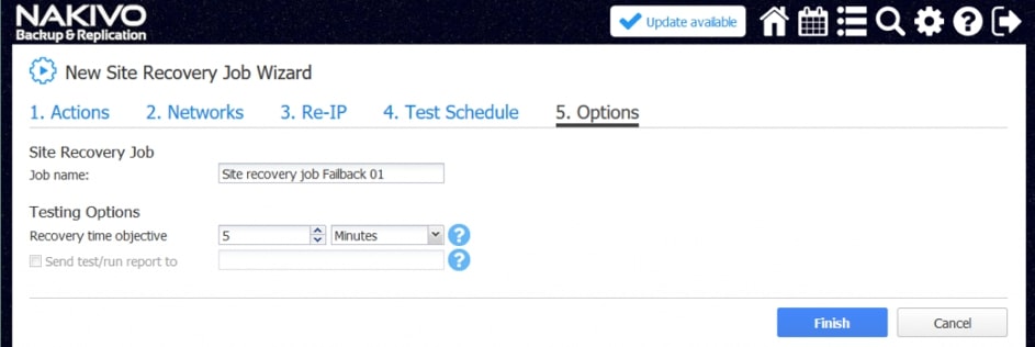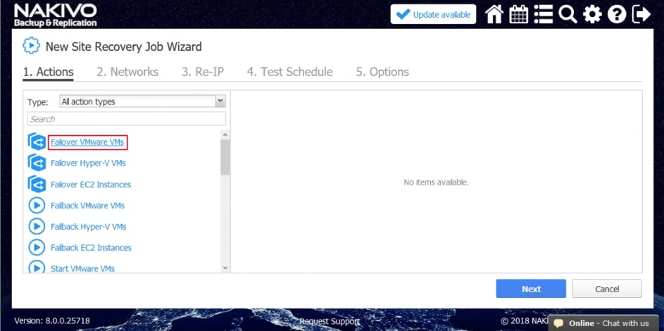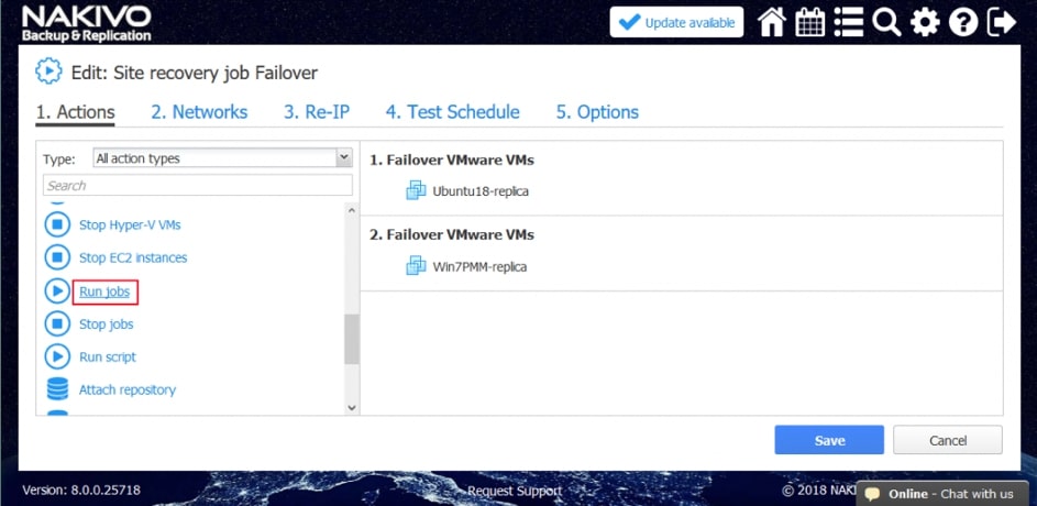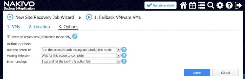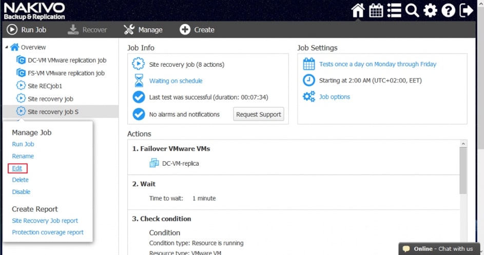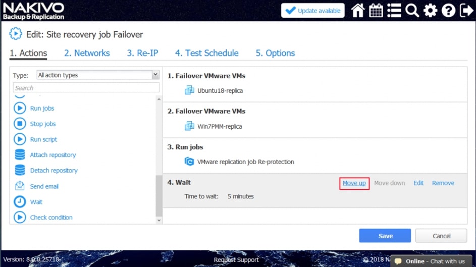 Zwieńczeniem automatyzacji procesów backupu i odtwarzania w Nakivo jest mechanizm Site Recovery. Mechanizm Site Recovery umożliwia utworzenie zestawu akcji, które mają być realizowane przez oprogramowania w określonej przez administratora kolejności w wypadku gdy dojdzie w środowisku do awarii, planowany jest serwis wirtualnej infrastruktury lub musimy udowodnić dla potrzeb wszelkiego rodzaju audytów wewnętrznych i zewnętrznych jak skutecznie i szybko jesteśmy w stanie odtworzyć nasze środowisko.