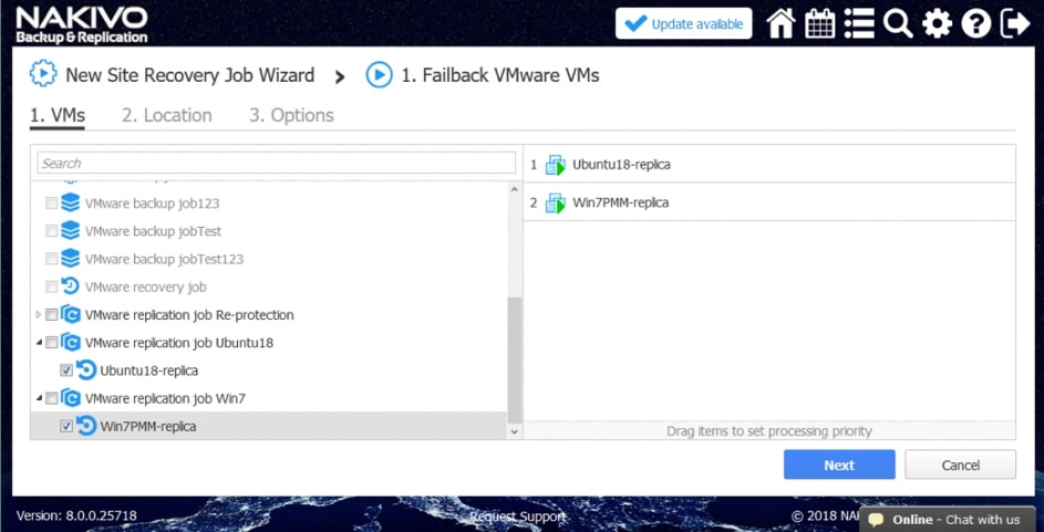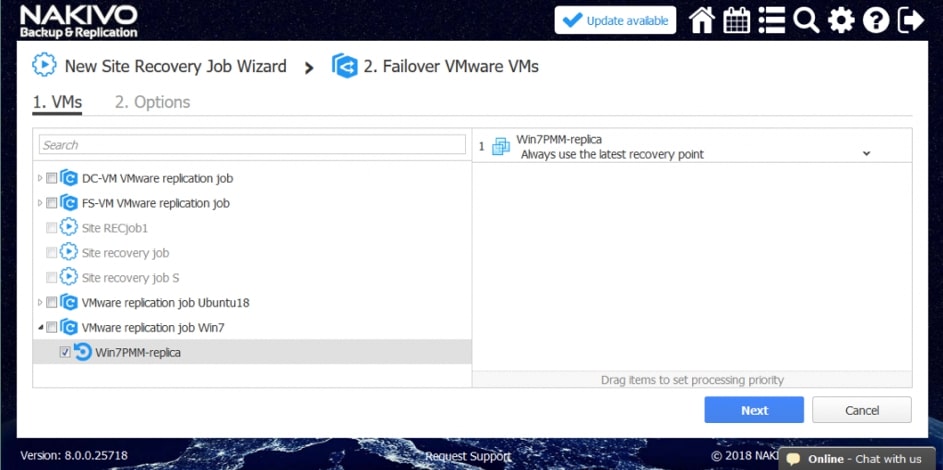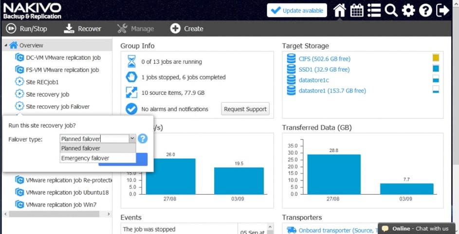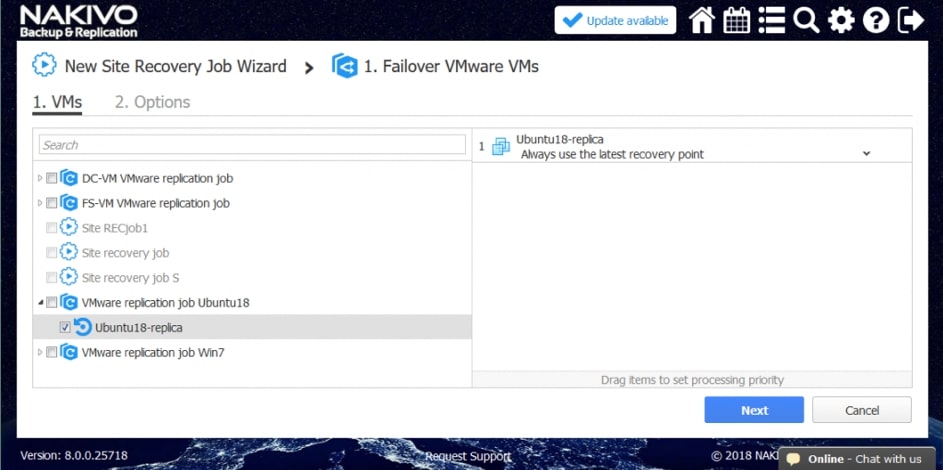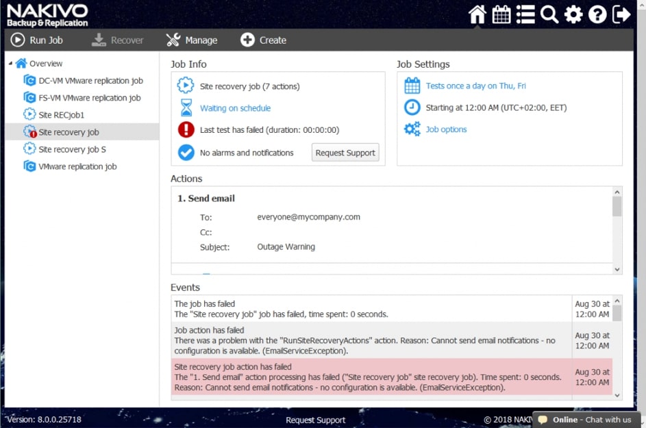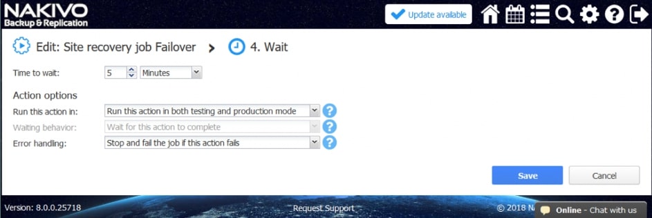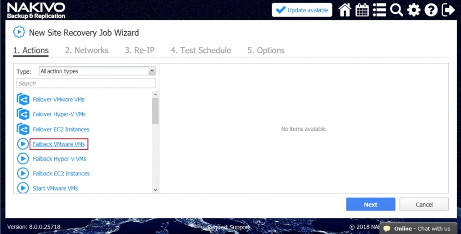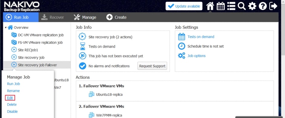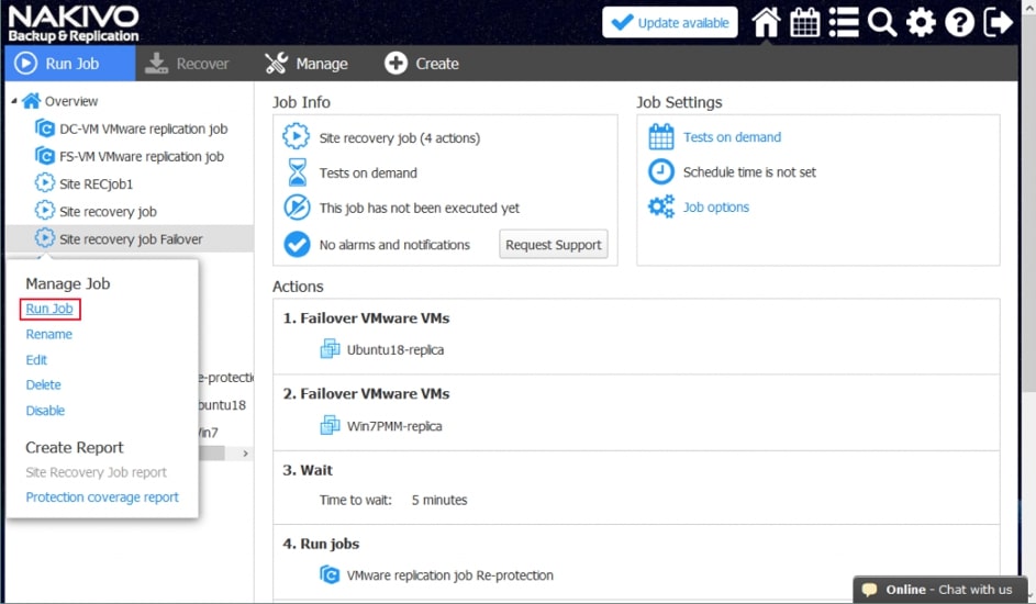 Zwieńczeniem automatyzacji procesów backupu i odtwarzania w Nakivo jest mechanizm Site Recovery. Mechanizm Site Recovery umożliwia utworzenie zestawu akcji, które mają być realizowane przez oprogramowania w określonej przez administratora kolejności w wypadku gdy dojdzie w środowisku do awarii, planowany jest serwis wirtualnej infrastruktury lub musimy udowodnić dla potrzeb wszelkiego rodzaju audytów wewnętrznych i zewnętrznych jak skutecznie i szybko jesteśmy w stanie odtworzyć nasze środowisko.