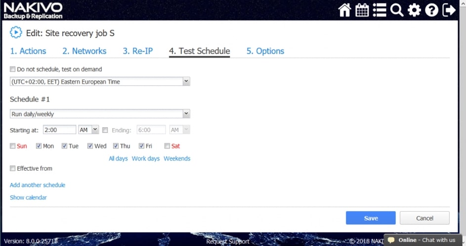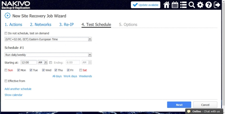 Automatyzacja zadań backupu i replikacji to jeden z elementów na który rozwiązanie Nakivo kładzie duży nacisk. Podstawą planowania procesów automatycznych jest odpowiednie ustawienie harmonogramów kopii zapasowych lub replikacji, w tym celu Nakivo oprócz możliwości utworzenia kilku harmonogramów w jednym zadaniu, udostępnia tzw. Calendar Dashboard dzięki któremu widzimy już zaplanowane zadania i łatwiej planować okna serwisowe.