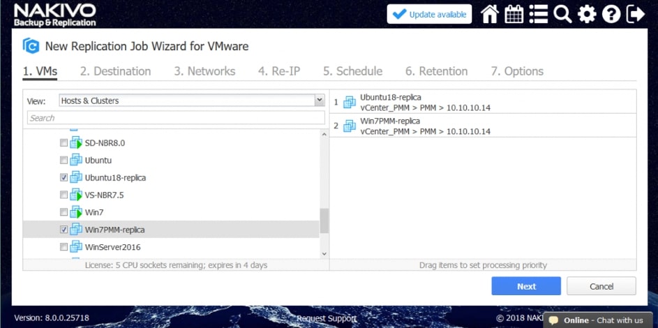 Rys. 3 Widok podstawowy wyboru maszyn do zadania backupu lub replikacji: Hosts&Clusters