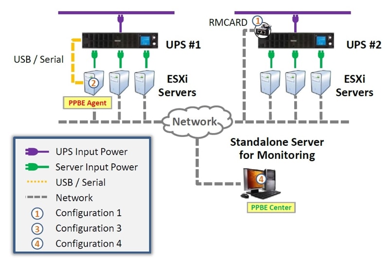 Standardem jest monitorowanie stanu UPS za pomocą zainstalowanej w nim karty sieciowej, a ewentualne działania w sytuacji awaryjnej są podejmowane na podstawie komunikacji sieciowej pomiędzy tą kartą a jakimś oprogramowaniem zainstalowanym po stronie wirtualizatora lub na fizycznym systemie.