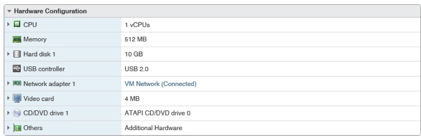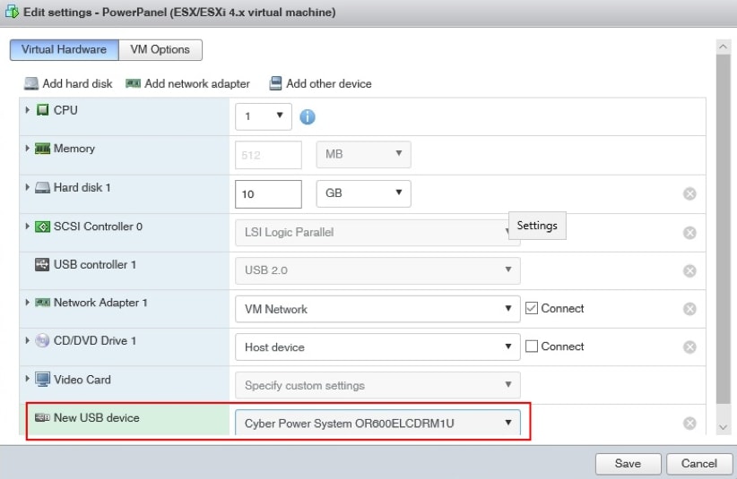 Rolę agenta w środowisku wirtualnym może pełnić albo karta sieciowa zasilacza awaryjnego, albo malutka maszyna wirtualna, która może komunikować się z UPS za pomocą… kabla USB, podłączonego do hosta fizycznego. Dla środowiska ESXi, CyberPower udostępnia przygotowaną do wdrożenia w postaci OVF malutką maszynkę wirtualną opartą o CentOS. Wymagania są naprawdę symboliczne: