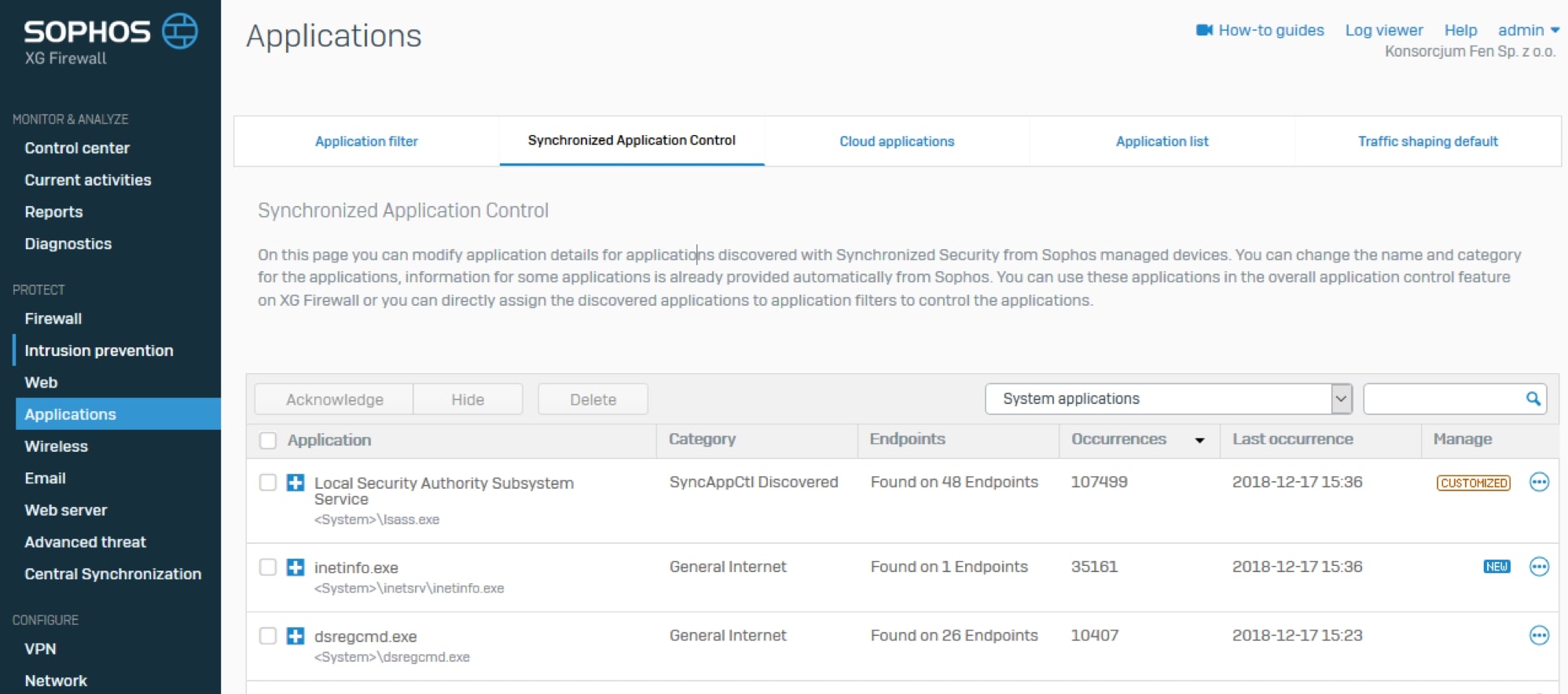 Kolejną wartą zauważenia zmianą jest rozszerzenie funkcji Synchronized Application Control wprowadzonej wraz z poprzednią wersją SFOS, która dzięki mechanizmowi nieustającej wymiany informacji między zaporą na brzegu sieci a chronioną przez nią stacjami roboczymi i serwerami, pozwala kontrolować dowolne, w tym nieopisane sygnaturami aplikacje sieciowe.