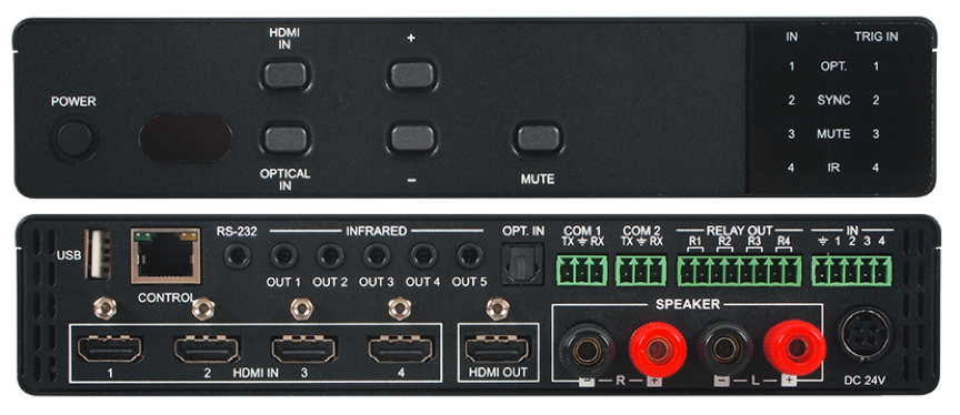 Za przykład wykorzystania standardu µCS zaproponowałem prosty, a zarazem bardzo funkcjonalny zestaw. Składa się on ze switcher’a HDMI z wbudowanym wzmacniaczem audio przedstawionym na poniższym zdjęciu.