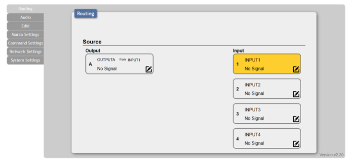 W menu głównym widać podłączenie do urządzeń źródła sygnału i wyjścia. Z tego poziomu możemy sterować switcher’a. Istotne jest także nadanie odpowiednich nazw dla kanałów. Ułatwi to późniejsze konfigurowanie i pracę z systemem.