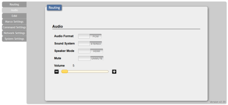 Jak wspomniałem wcześniej urządzenie posiada także wbudowany wzmacniacz audio. Ze względu na to w panelu konfiguracyjnym pojawia się także zakładka odpowiadająca za audio (przedstawiona poniżej). Z tego poziomu użytkownik może również sterować dźwiękiem od podstawowej funkcji zmiany głośności po wybór formatu i systemu audio.