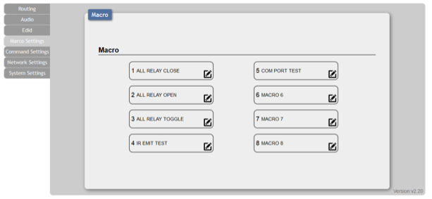 Najistotniejszym elementem całego Web GUI jest zakładka Macro Settings, w której łączymy wszystkie funkcje urządzenia w jedno makro mogące być sterowane przez klawiaturę opisywaną przeze mnie wcześniej. Widziany przez użytkownika panel (obraz ponżej) może również służyć do sterowania załączania odpowiednich makr jednak jego celem jest przede wszystkim tworzenie systemu sterowania.