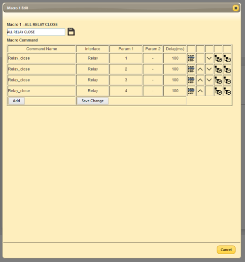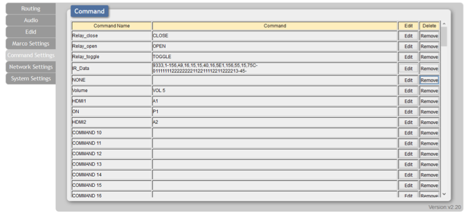 Po wybraniu przycisku edycji przy jednym z wybranych makr ukaże się okno przedstawione poniżej, w którym możemy dodać odpowiednie funkcje. Na rysunku poniżej przedstawione są komendy odpowiadające za zamknięcie wszystkich przekaźników znajdujących się w przełączniku wideo. Właśnie za ich pośrednictwem jesteśmy w stanie sterować oświetleniem, elektrycznie rozsuwanym ekranem lub żaluzjami.
