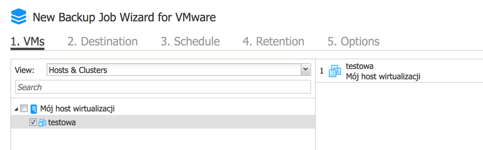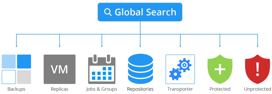 Możesz łatwo znaleźć kopie zapasowe VM, repliki, zadania, repozytoria i transportery, przeszukując całą infrastrukturę tworzenia kopii zapasowych. Możesz nawet uruchamiać zadania dla tych przedmiotów bezpośrednio ze strony wyników wyszukiwania.