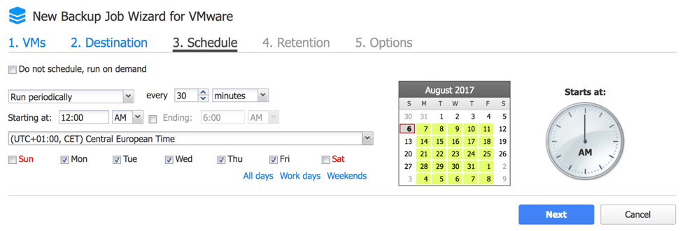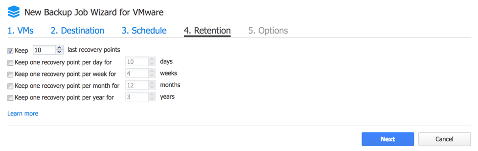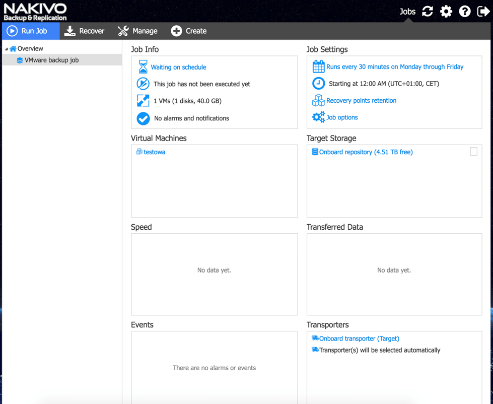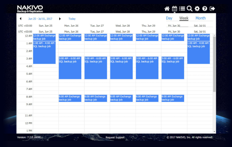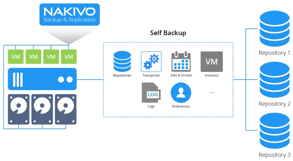 NAKIVO Backup & Replication v7.4 może wykonać kopię zapasową raz dziennie. Dzięki funkcji Self-Backup przywracanie wszystkich ustawień, obiektów magazynowych i harmonogramów zadań w nowej instancji jest tak proste, jak odzyskiwanie z najnowszej kopii zapasowej systemu.