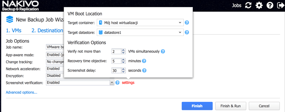 Tworzenie kopii zapasowej lub repliki maszyny wirtualnej Hyper-V niekoniecznie gwarantuje, że w razie potrzeby będzie możliwość odzyskania danych; kopia zapasowa lub replika może okazać się uszkodzona lub nie będzie można jej uruchomić. NAKIVO Backup & Replication v7.4 zapewnia zautomatyzowany sposób weryfikacji kopii zapasowych i replik VM Hyper-V w ciągu kilku minut.