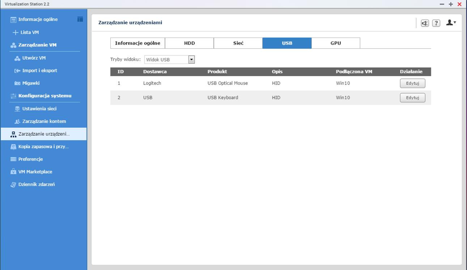 /W tym samym oknie na zakładce USB możemy analogicznie podłączyć urządzenia zewnętrzne do wybranej maszyny wirtualnej/