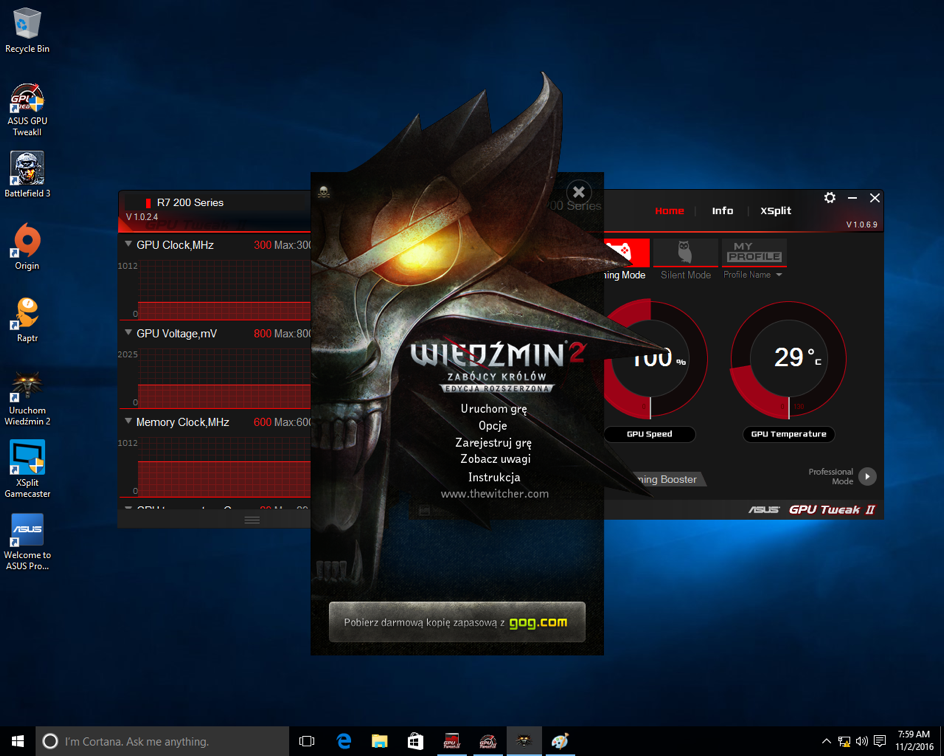 Tylko jak to sprawdzić? Można uruchomić jakiś benchmark, ale postanowiłem pójść dalej. Z półki uśmiechał się do mnie szpetnie Wiedźmin, w swoim drugim wydaniu (czyli Wiedźmin 2, Zabójcy królów). Szybko płyta wylądowała w napędzie i rozpoczęła się instalacja. Po jej zakończeniu gra poprosiła jeszcze o update (jedynie jakieś 10GB do pobrania z Internetu) po czym nastąpił dług wyczekiwany moment – uruchomienie. Efekt był bardziej niż zadowalający, gra uruchomiła się w najwyższych ustawieniach (Ultra) i chodziła płynnie.
