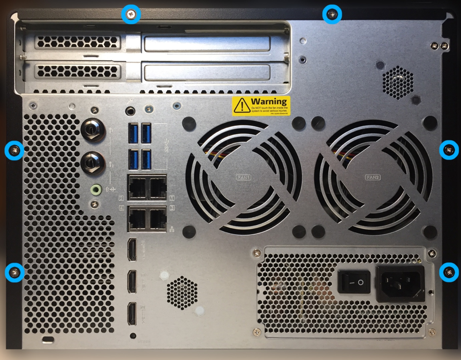 Zaczynamy od zamontowania karty graficznej w QNAP. W tym celu odkręcamy kilka śrub i zdejmujemy metalową obudowę. Jak widać na poniższych zdjęciach, możemy zamontować nawet karty wymagające dwóch miejsc na tzw. śledzie.