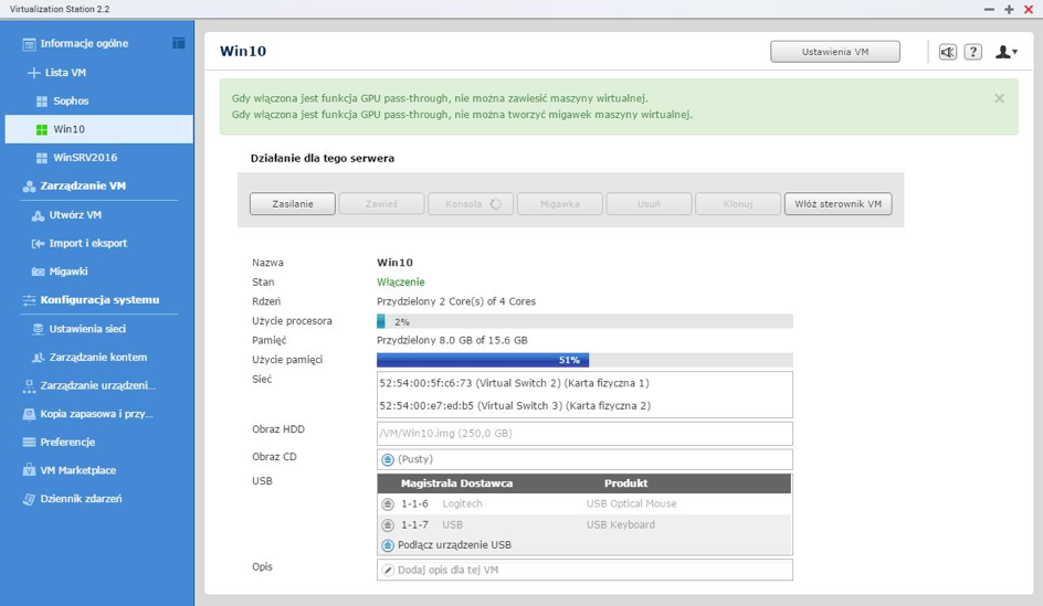 Jak widać, eksperyment zakończył się sukcesem. Warto zaznaczyć, że sam system zwirtualizowany działał podobnie wydajnie jak standardowo zainstalowany na fizycznym PC. Podłączając klawiaturę i mysz do QNAP zatarła się granica pomiędzy systemem fizycznym a wirtualnym, a także pomiędzy komputerem a urządzeniem, jakim jest QNAP NAS. Jest to o tyle istotne, że zazwyczaj takie urządzenia są postrzegane jako serwery plików – jednak tutaj producent udowadnia, że jest to nie tylko sieciowy storage, ale zaawansowane urządzenie oferujące wirtualizację, na którym nawet można pograć w bardziej wymagające graficznie gry. Oczywiście, wykorzystanie QNAP w takim celu jest wątpliwe, jednak powyższy przykład miał na celu pokazanie możliwości urządzenia – nikogo nie nakłaniam do zmiany konsoli na QNAP. Lepiej mieć oba urządzenia. A zupełnie poważnie, opcja GPU passthrough w modelach QNAP TVS-x82 działa wydajnie i bezproblemowo, dzięki czemu maszyny wirtualne mogą oferować lepszą obsługę grafiki oraz pracę wielomonitorową. W ten sposób wspomniane modele stają się naprawdę wszechstronnymi urządzeniami, które np. mogą być wykorzystywane przez grafików, agencje reklamowe czy firmy produkujące wideo (co wymaga wyższej wydajności GPU).