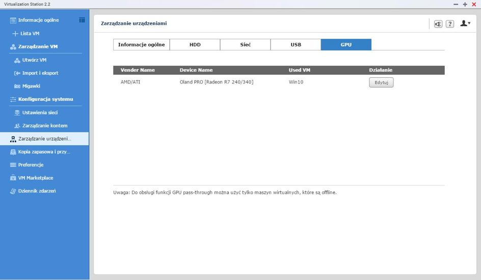 Warto tutaj wspomnieć, że nawet bez dodatkowej karty graficznej, ekran maszyny wirtualnej może zostać wyświetlony na zewnętrznym monitorze podłączonym do HDMI. Wykorzystujemy wtedy wbudowany w QNAP port HDMI oraz aplikację HybridDesk Station. Jednak nas interesuje wykorzystanie dodatkowej karty. W tym celu należy ją podłączyć do wybranej maszyny wirtualnej. Przechodzimy więc do zakładki menu Urządzenia zewnętrzne > GPU gdzie na liście zobaczymy naszą kartę. Z rozwijanej listy wybieramy maszynę wirtualną, do której przypiszemy kartę. Uwaga – na tym etapie maszyna wirtualna musi być wyłączona. Klikamy przycisk Edytuj i wskazujemy maszynę wirtualną na liście. Zatwierdzamy klikając Zastosuj.